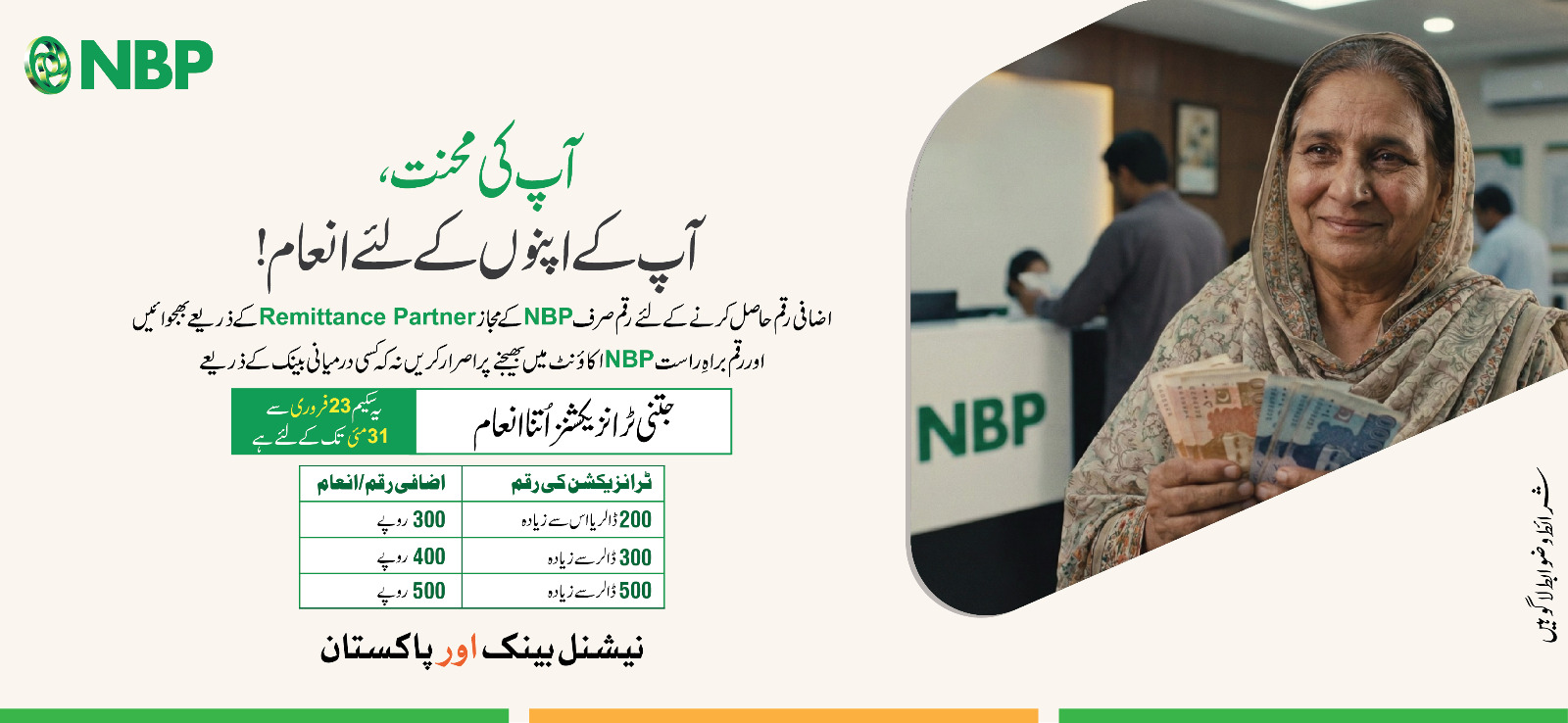 National Bank of Pakistan provides its Remittance Customers the facility to receive their remittances from a vast network of 1500+ branches across Pakistan. National Bank of Pakistan has remittance partners in every country and territory of the world, so no matter where you are in the world, you can send your remittances to your loved ones through National Bank of Pakistan by visiting one of our correspondent tie-up partner in your country.
